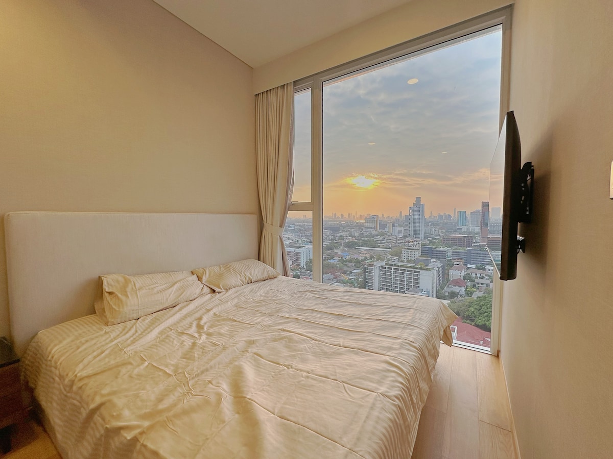 A spacious entire apartment with private bath, kitchenette, living/dining, 1 bedroom with designated working area, and balcony. Enjoy the wide windows for uninterrupted views and plenty of sunlight, increasing airiness for a more relaxing stay. Enjoy all the conveniences of city-life, including: - 5 min to BTS Asok, MRT Sukhumvit - 5 min to Terminal 21, Emporium/Emquartier and Benjasiri Park - 1 min to 7-11 convenient store - Lots of street food, cafe and taxi/bikes