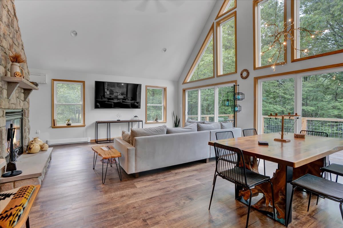 Retreat to this five bedroom Poconos getaway in the heart of Towamensing Trails 5 minute walk from the community lake house. Surrounded by trees and built for families, this home features a private hot tub, a large wraparound deck, a stone-fireplace great room, a game room with pool table, and a fully stocked kitchen for real meals and real memories. Guests enjoy access to the community lake, beach, and outdoor pool, plus quick drives to the region’s top ski slopes, parks, and attractions. This
