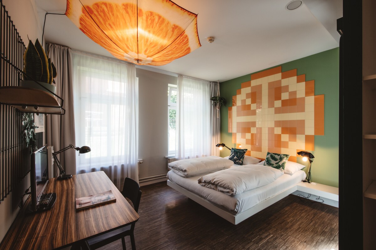 Unser Superbuden-Guesthouse ist nicht nur das kleinste Hotel der Stadt, vielleicht auch das gemütlichste! Das Guesthouse ist auf der gegenüberliegenden Straßenseite von der Superbude und perfekt für Gruppen geeignet, denn hier hat man sicher seine Ruhe! Ausgestattet mit allem drum & dran wurde auch den Doppelbuden in dem Guesthouse ein bunter Paradise-Look verpasst. Ein super bequemes 160er Doppelbett schafft den Mittelpunkt des Raumes umgeben von einem Urban Jungle.