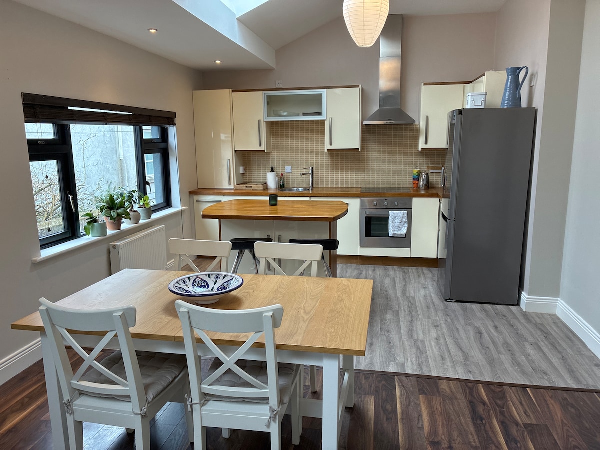 Executive apartment, bedroom with SUPER KING size bed ( 6 ft. Wide) and kitchen with all new appliances, bathroom equipped with Roca sink unit, wc and bidet, Power shower and chaise lounge. Sitting room to relax with Samsung smart 55" TV DVD player & tranquil location. Car park in porch which means you can bring luggage, groceries etc. with the assurance you can disregard local weather conditions. Exclusive access to the porch and apartment. NEW SERVICE FOR GUESTS. CHARGE YOUR EV overnight.