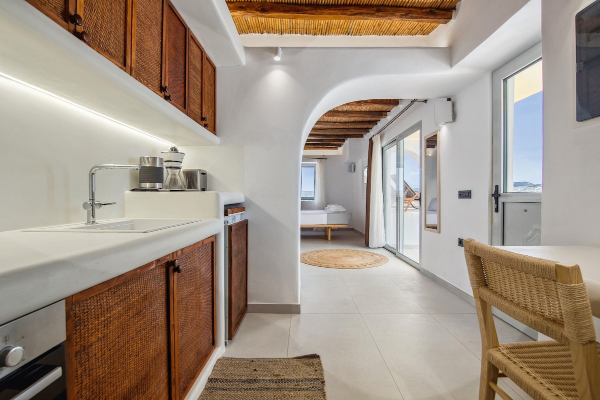 Traditional Cycladic cave - villa made of wood and stone. Panoramic view of Adamas and the port. Large openings allow light to pass unhindered into the space and act as a tableau vivant on the theme of the natural environment. At 40 sq.m. of the interior are included: bedroom, fully equipped kitchen, living room and bathroom. The outdoor area has a swimming pool. Complete privacy, peace and quiet. Central location, 4 minutes from the port and 7 from the airport.