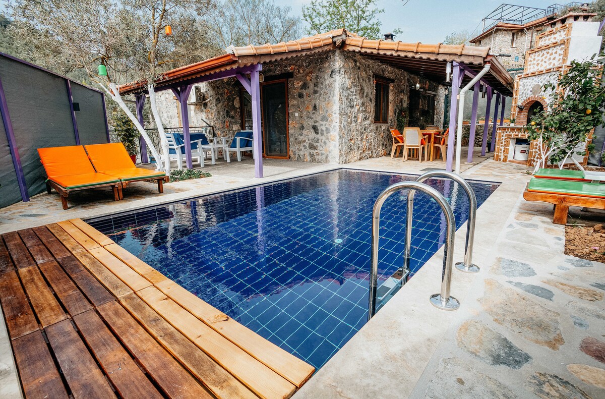 Our villa, which was born with the restoration of a 700-year-old stone house in the fascinating atmosphere of Kayaköy, offers a quiet and peaceful getaway in touch with nature. It has a capacity of 4 adults + 1 child (5 people) with 2 bedrooms. You can enjoy away from prying eyes thanks to the sheltered private pool area. Ideal for honeymooners and families; the beds in the 2nd room can be combined. Ships 4 km, Ölüdeniz 7 km, Center 6 km.