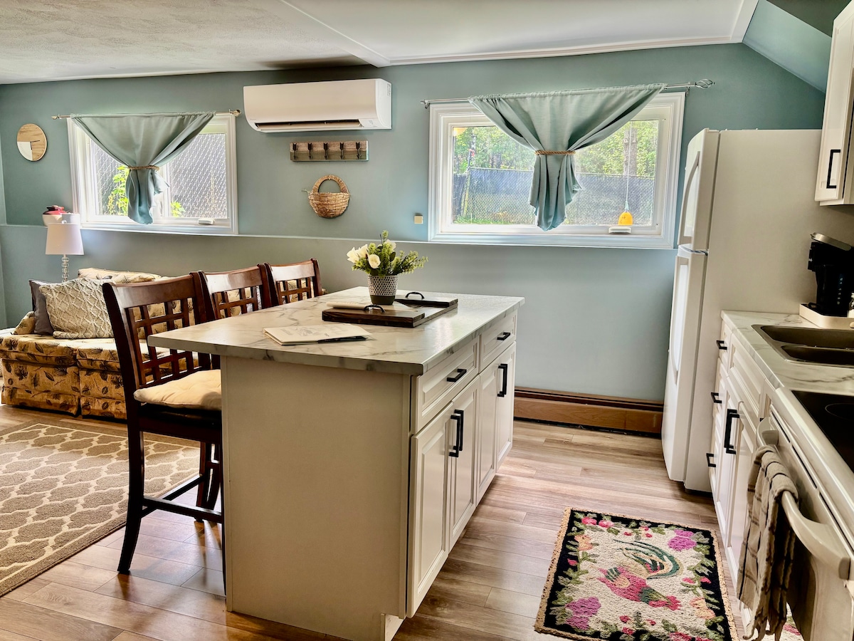 Kick back and relax in this stylish space. One of two short term rentals at this location. The kitchen has coffee bar, a farmhouse sink and a pantry. The living room’s shiplap wall houses 55” tv and an electric fireplace. It also has a pull out couch. With 2 br., 11/2 baths, this unit sleeps 4 The outdoor space was built for entertaining, large deck is partially covered so you can enjoy on a rainy day. Propane and wood fire-pits. Walk to restaurants, bars,markets and shops. Pet friendly