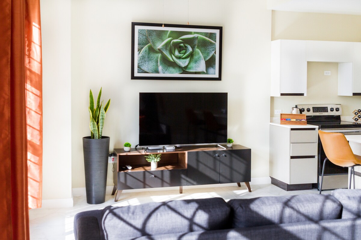 This bright and stylish centrally located 1-bedroom apartment is the perfect space for your stay. It’s Located within 8mins walking distance or 2mins drive to Starbucks, supermarket, pharmacy, and local restaurants. The contemporary living space has everything to make you feel at home Wi-Fi, local cable, Netflix, washer/dryer, ac units, king size bed, a well equipped kitchen and tableware. Have a glass of wine and enjoy the beautiful sunset on the balcony after a long day of work or play.