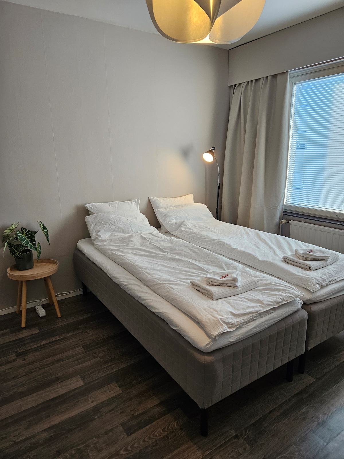 Valoisa yksiö historiallisessa rakennuksessa on sisustettu tunnelmallisesti historiaansa kunnioittaen. Asunto on lämpimästi valaistu avara kokonaisuus, josta löytyy olohuoneeseen aukeava makuualkovi, nojatuolit tv:n katseluun, tilava ruokapöytä, keittiö, hyvät säilytystilat eteisessä ja siisti tilava wc/suihkutila. Makuualkovin sängyt voidaan vieraan toiveiden mukaan pedata joko parisängyksi tai kahdeksi erilliseksi vuoteeksi.