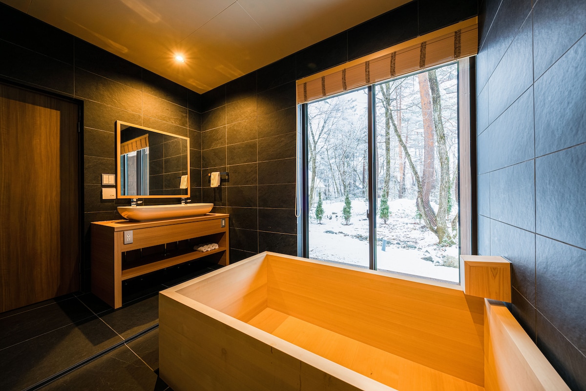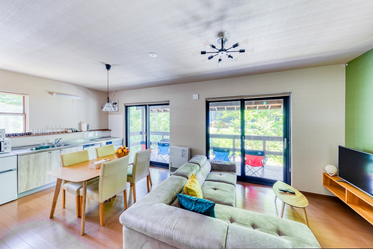 Located in Wadano woods with a breathtaking view overlooking the Happo Resort slopes, it is a beautifully designed timber-framed house. A perfect location overlooking the slopes of Happo Resort. Nestled in a quiet forest, this stylish villa offers a million-dollar view from the wide windows. Guests can enjoy the pleasure of looking out at the ski slopes while taking a relaxing bath. Spend a luxurious vacation at Fuku Chalet with an unforgettable view!
