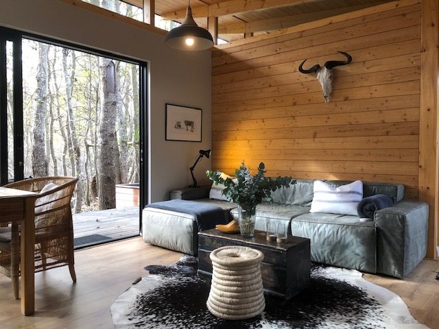 Built from Larch & Spruce cured to a dark finish, this secluded one bed-roomed chalet blends into the surrounding Poplar forest nestled next to a running stream. A King size bed, a luxurious bathroom with sliding door onto deck for a indoor/outdoor shower experience. The living-room/ kitchen is stylishly furnished & is fully equipped, with under counter fridge & gas hob, and a wood burning fireplace. Big picture windows & sliding doors open onto the deck, drawing the peaceful forest inside.