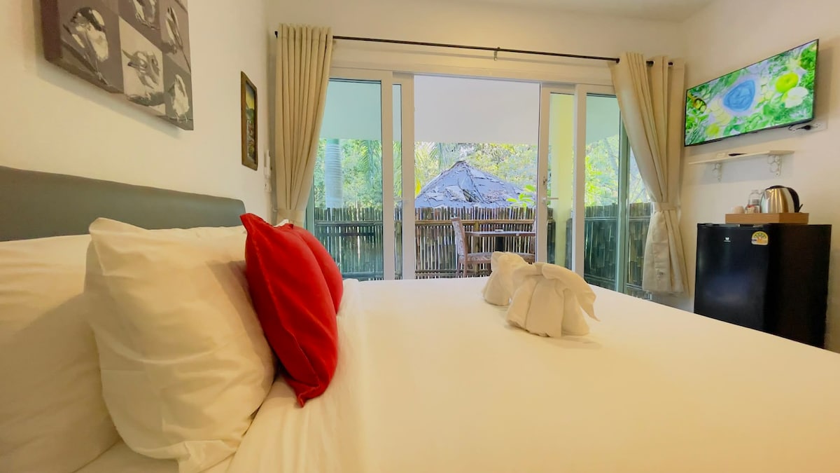 Up to 35% - long stays during low season. 2023 built, simple bungalow, big balcony, spacious bathroom with walk-in shower. Tinted windows from floor to ceiling, blackout curtains + mosquito nets. Equipped for a short or long vacation, right in the heart of Lonely Beach village. Hairdryer, toaster, kettle, microwave, fridge, TV, aircon, floor fan, workspace, large king-size bed, clothes boxes, clothes hanger, safe deposit. The exact location is on the map - Bamboo Hut restaurant, no fraud.