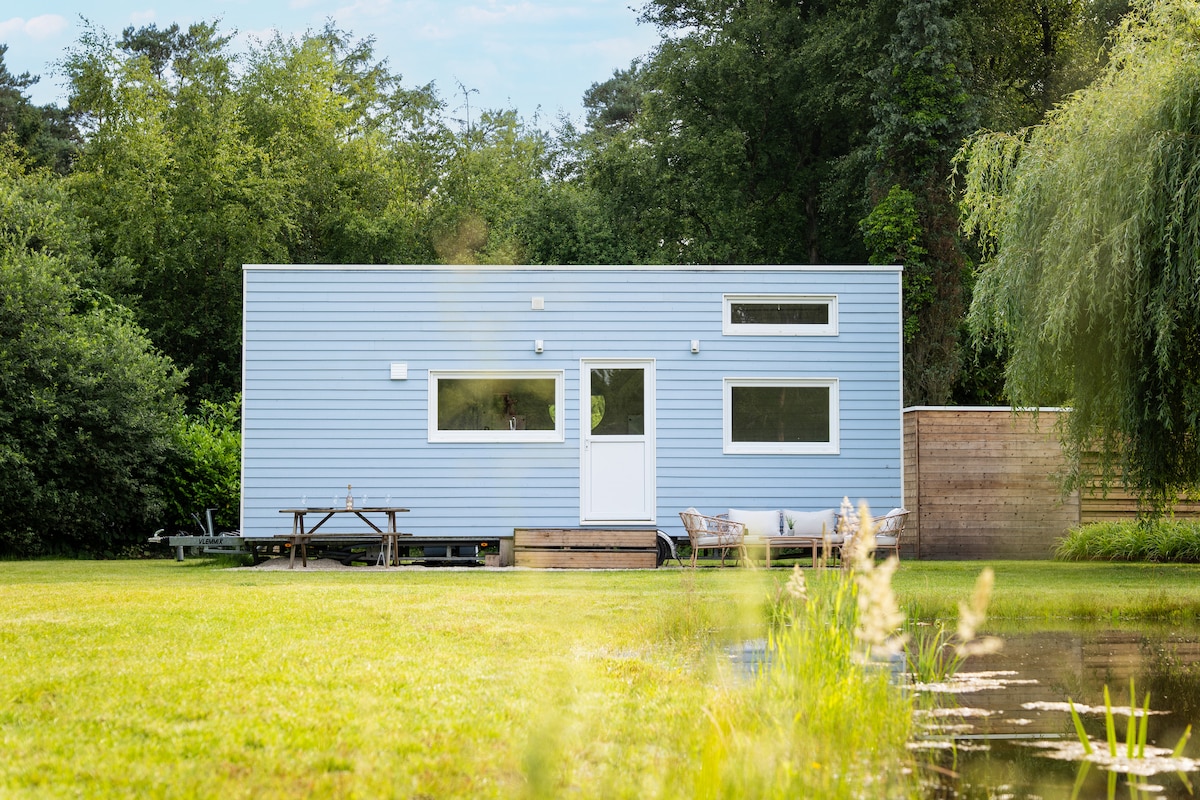 Idyllische tiny house met vijver en vuurplaats