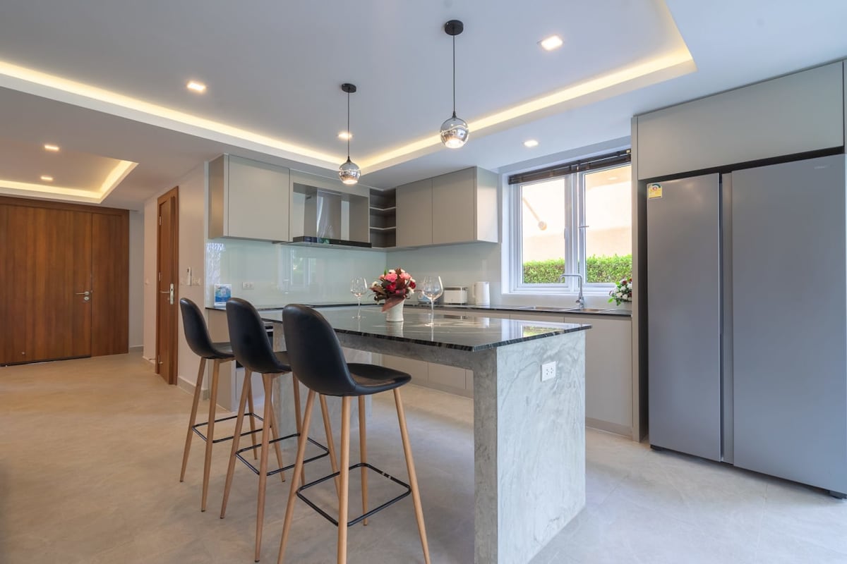 Beachfront house in Siam Royal View, Koh Chang! This beautiful house has direct access to the beach, private pool and features 4 bedrooms with 3 bathrooms. You can enjoy the stunning views of the ocean from the comfort of your own home. The house is near a family-friendly beach club with 2 restaurants. Enjoy delicious meals while enjoying the beautiful scenery. This house is perfect for those who want to relax and enjoy the beauty of nature. Perfect place to spend time with family&friends