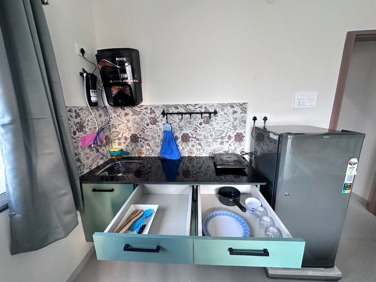 Relax in this modern, fully furnished studio designed for comfort and productivity. Enjoy a cozy living area with TV, dining table, and center table. The bedroom comes with a comfortable bed, private kitchen, and a balcony featuring a hanging chair. Guests also get access to co-working space and a gym, making it ideal for work trips or long stays. A perfect blend of comfort,convenience, and lifestyle living.