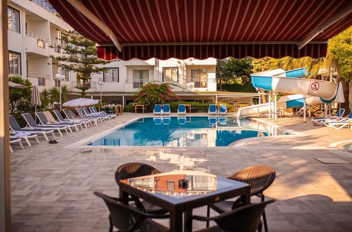Just steps from Side’s beautiful beaches, our cozy boutique hotel offers everything you need for a relaxing getaway. The room includes a comfy double bed, seating area, kitchenette, washing machine, and fridge. Enjoy the traditional Turkish hammam, unwind with spa treatments, and cool off in the outdoor pool. With a warm vibe, stylish space, and a great location, it’s the perfect place to relax and enjoy the Mediterranean.