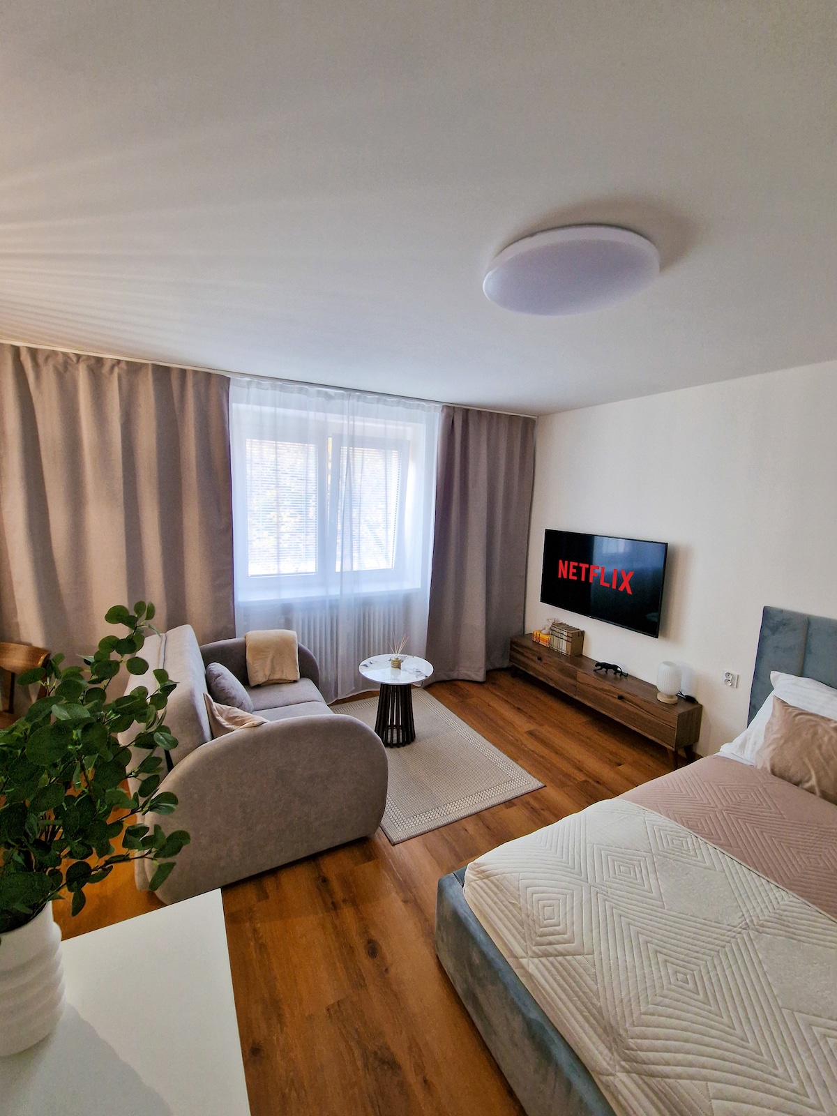 💫 Unwind in style and comfort💫 Stay in this cozy, modern studio just a 5-min walk from Main Street (Hlavná) with shops, cafés, and restaurants. 📅 Book your stay today! 🚀 ✨ Features: 🛌 King-size bed (180x200 cm) for ultimate comfort 💻 Dedicated workspace & fast WiFi 📺 Smart TV for your entertainment ❄️ Air conditioning 🌿 Balcony to relax 🚗 Free parking 🛒 Grocery store, restaurant, pharmacy & ATM 1 min away 🚉 Bus/train stations 25-min walk/ 5-min drive ✈️ Airport 15-min drive ❓ Send me a message