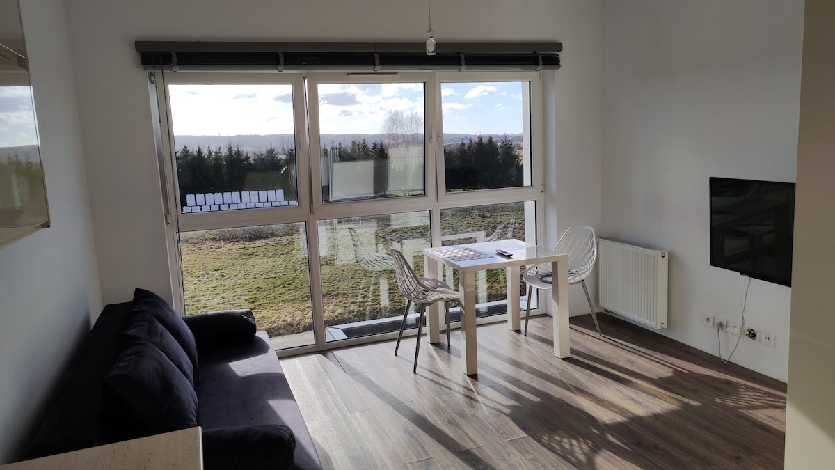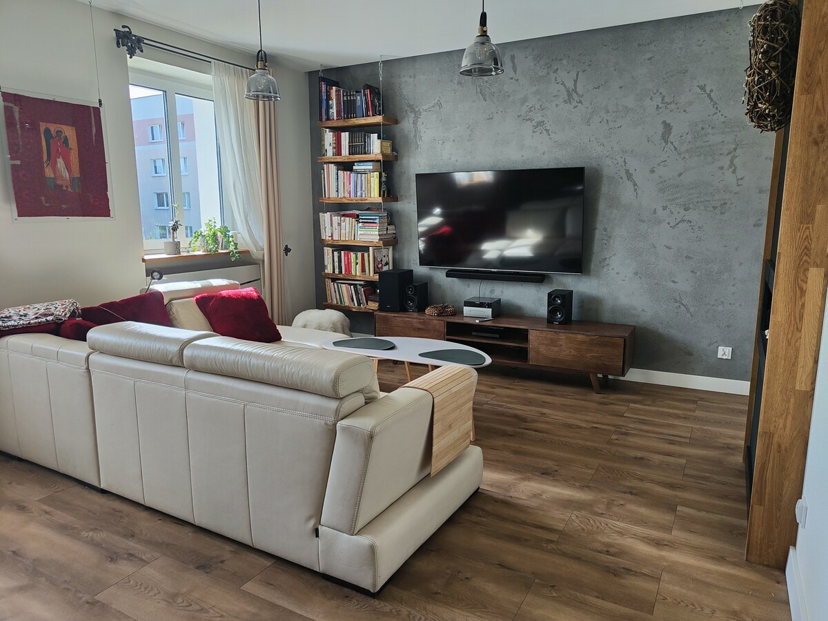This is a private one bedroom apartment located on the first floor of the 3-story building with access to the kitchen, bathroom, living room and balcony. You can easily access super fast broadband and Netflix channels - without limits. Free use parking. There is a beauty salon in the building (earlier reservation required), opposite the building there is a wellness clinic, a health center and a municipal swimming pool. Book your stay with us!