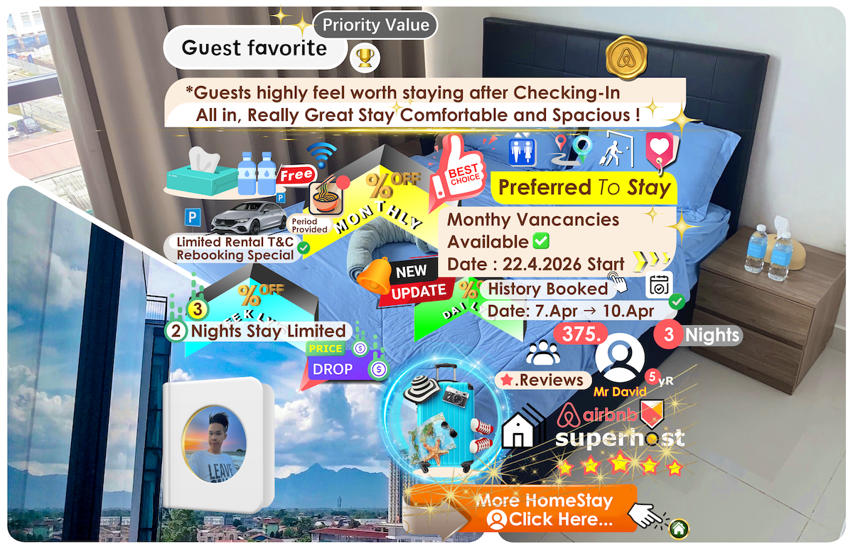 Armadale Residence Homestay 📍 Location: Gala City ✨ Unit Details: ▪️ 3 Bedrooms • 2 Bathrooms ▪️ Maximum 10 persons — suitable for family & group stays 🚗 Nearby Hotspots: ▪️ 5 mins ➜ Airport ✈️ • Premiere 101 (Local Delights & Food 🍜) • CityOne Megamall • Emporium (Food & Dessert 🍰) • Saradise (Restaurants • Bars 🍹 • Café ☕) ▪️ 8–10 mins ➜ Vivacity Megamall • Boulevard Shopping Mall • Aeon Shopping Mall • The Spring Shopping Mall