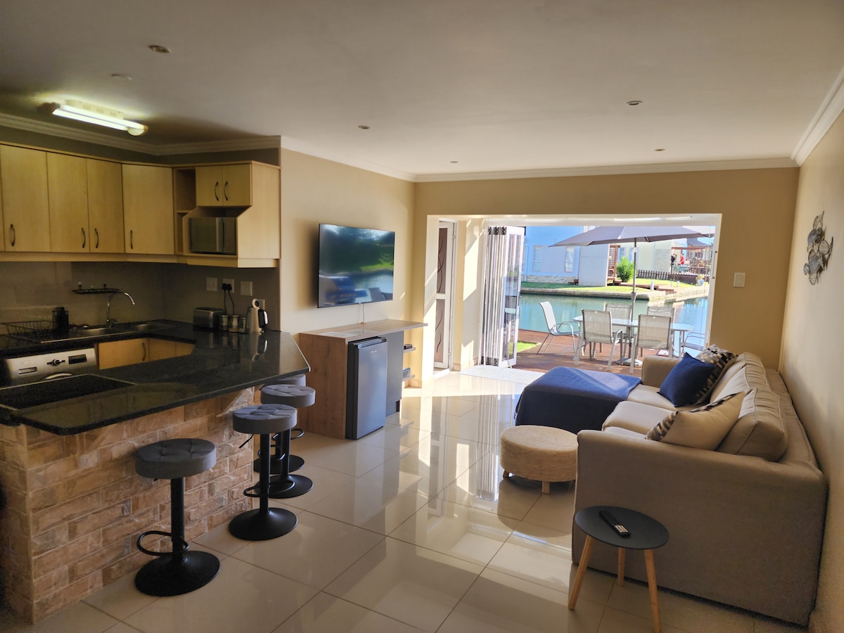 24 hr security. Marine & birdlife, and small buck roaming free. 5kms of fresh sea water canals for swimming, cruising, kayaking, canoeing, running, walking, and an open-air gym. The unit has a private entrance, one parking bay, outdoor area with a Weber, and a shaded deck with seating, and a braai facility 10 steps away. Your friendly host lives on-site with fully separated spaces for privacy. Quiet hours: 21:00 (weekdays) and 22:00 (weekends).