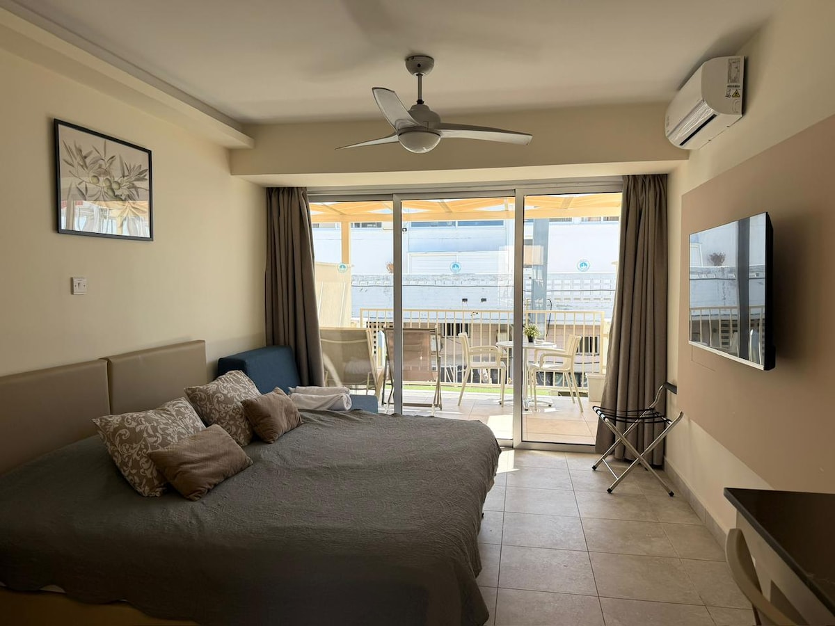 This panoramic sea view studio apartment is overlooking the Harbor and Medieval Castle of Paphos. It is located in the heart of tourist and historical area of Kato Paphos, a minute walk to the sea, promenade, bars, restaurants etc. The studio apartment is compact (21 sqm), with private bathroom, fully equipped kitchenette, balcony, A/C, free WIFI and smart TV. Breakfast is included at our Harbour restaurant located just around the corner starting from 9:30 am - 11:30 am.