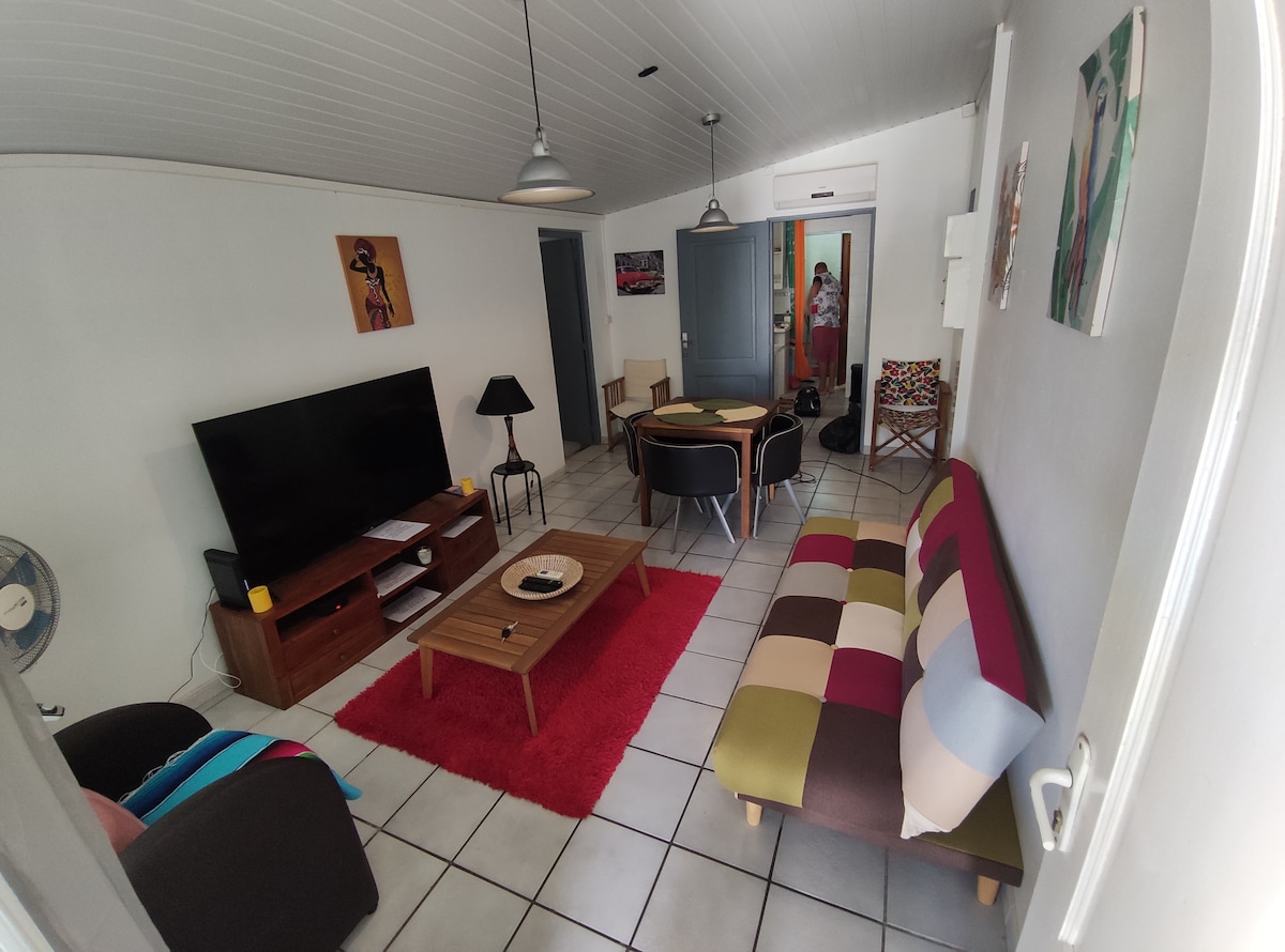 Large independent studio fully equipped 50 meters from the beach and the waterfront of Kourou. Close to all amenities (grocery store in front of the accommodation and several restaurants 2 minutes' walk). The accommodation includes: 2 double beds, a living room area with sofa bed and TV, a fully equipped and furnished kitchen (fridge, washing machine, stove, microwave, kettle, toaster...) and a separate bathroom.