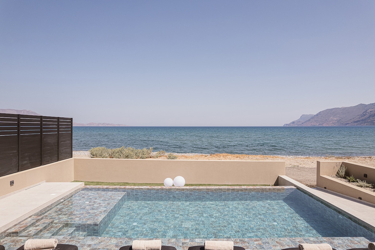 An infinity pool is seen reflecting the sunset over the Cretan sea. Lounge chairs are positioned around the pool, complemented by minimalist landscaping. A palm tree adds a touch of greenery, while the distant horizon features a soft gradient of colors as day transitions into evening.