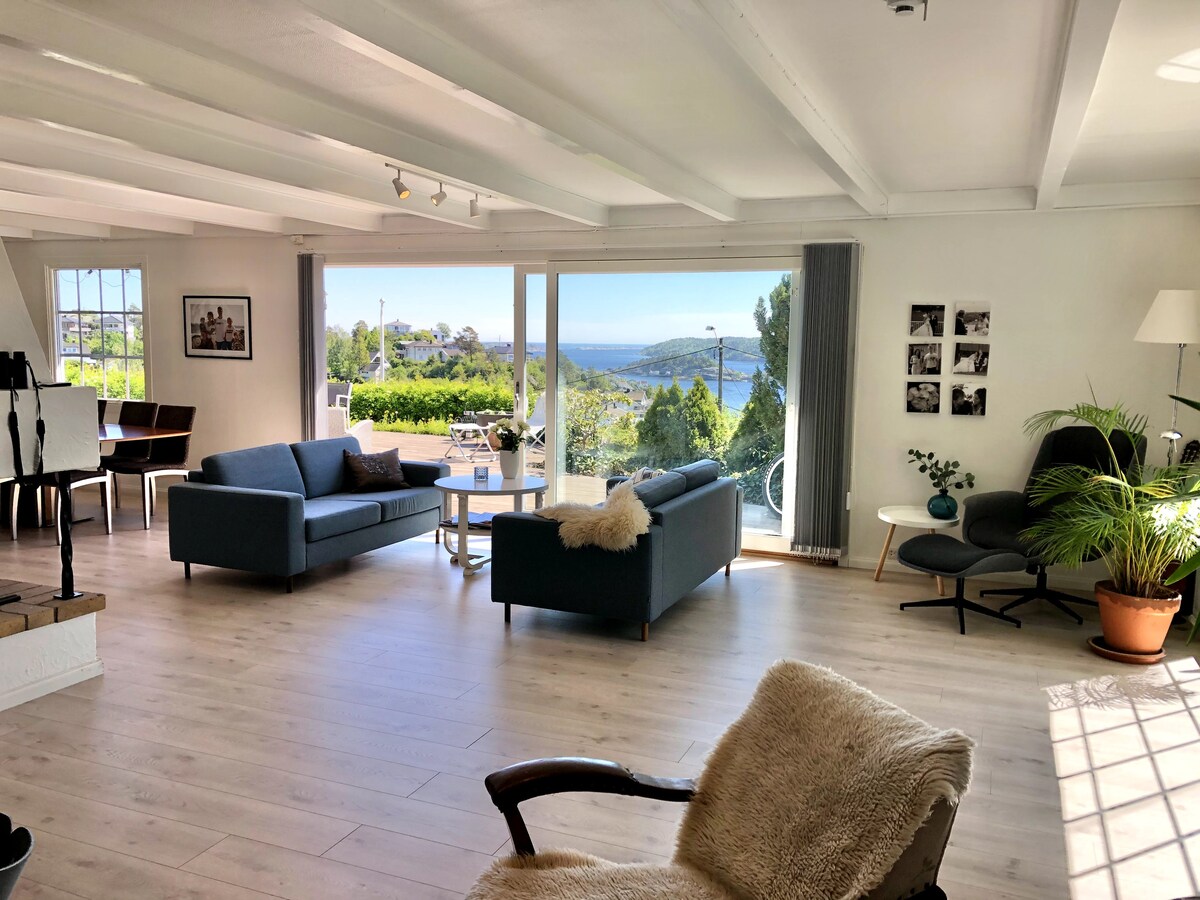 stort hus med sjøutsikt og nærhet til det meste. nyoppusset kjøkken og stue 15 min gange til sentrum 10 min gange til dagligvare, fotballstadion, badeplass, skate-rampe, utendørs basketbane, pump-track busstopp og lekeplass med ballbinge som nærmeste 'nabo' Båtplass 5m 10min kjøring unna 4 soverom pluss TV-stue/rom (master bedrom, gjesterom, to store soverom rigget for barn). dbl garasje stor veranda med gassgrill, pizzaovn, sittegruppe og spisegruppe rolig strøk m/ svært liten trafikk