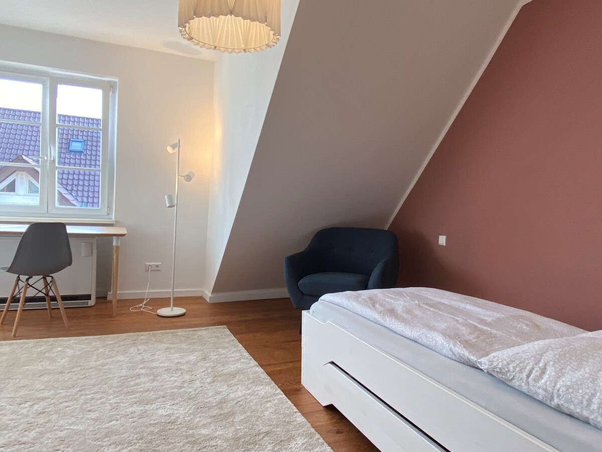 On 100 square meters of living space you will find a modern designed accommodation with a cozy sitting area, Netflix TV, an open fully equipped kitchen with a large dining table. There are three bedrooms with comfortable box-spring beds (one of which can be separated into single beds) and a bathroom. The garden invites you to linger with its spacious dining area under the birch trees. Please note that the parking spaces are video monitored.