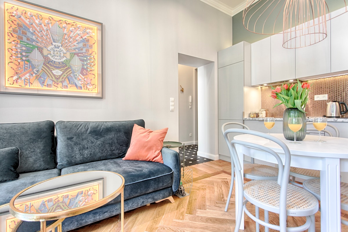 A unique apartment that captivates with its stylish design and modern equipment. The spacious interiors have been enriched with comfortable furniture, functional appliances and tasteful decorative accessories. A designer combination of avant-garde and classic arrangement elements translates into an effective whole. This elegant apartment includes: a kitchenette with a dining area, a lounge area, a balcony, two bedrooms and a bathroom.