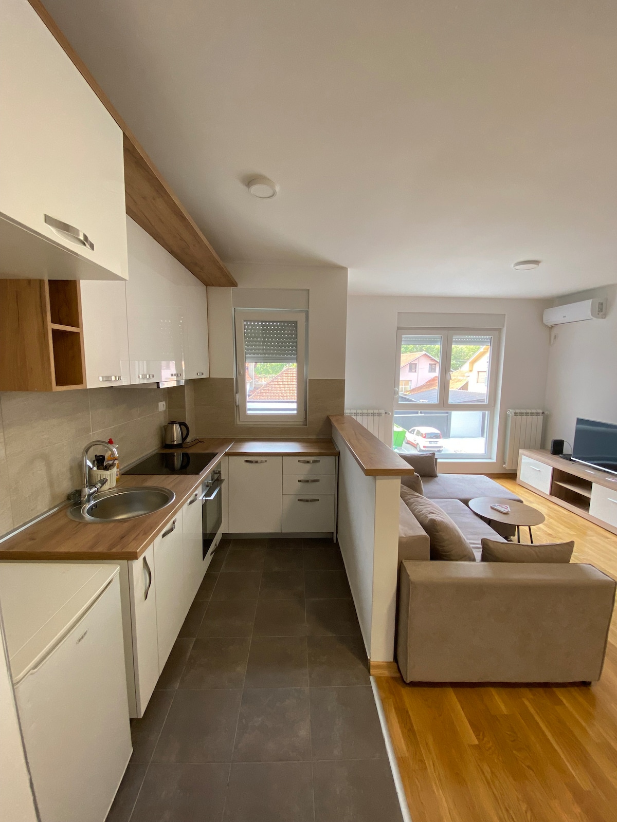 This brand-new, luxury apartment spans 70 square meters and is located in the heart of downtown Čačak. The spacious main bedroom features a large queen-size bed, while the smaller bedroom has a comfortable single bed. The living room includes a pull-out sofa for additional guests. The apartment boasts two bathrooms, with floor heating in the larger one, and a fully equipped kitchen. High ceilings (3 meters) Bright and quiet unit Air conditioning Wi/Fi 55 inch TV Private parking Secure property