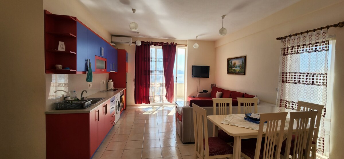 Beautiful one bedroom apartment with a big Living room and kitchen in the center of Sarande. Lately renovated with modern furniture and appliances. Beautiful view of the city during day and night. 3 mins away from the beach and the pedestrian walk. Very close to the grocery stores and cloth boutiques. (Note: The building has no functional elevator so be prepared to climb stairs)