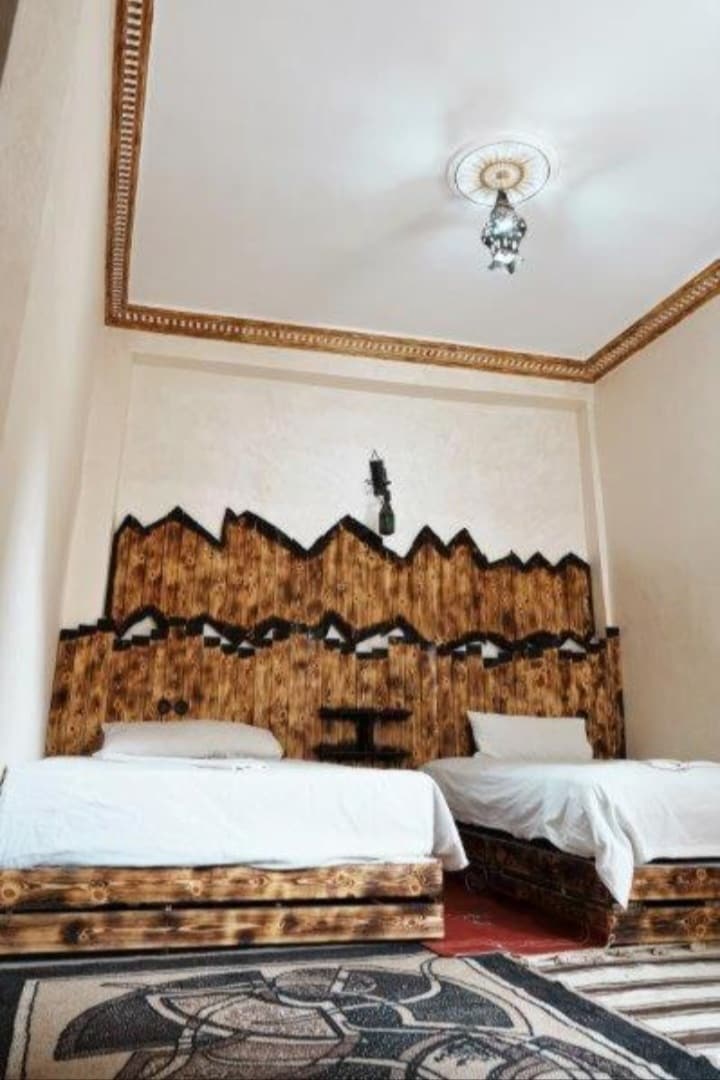 Spacious and serene 220 m² living space with 4 bedrooms and 4 bathrooms. Unique view of the palm grove. Road leading to the Todra Gorges (tourist site for mountaineers, etc.) and the natural fish spring. Breathtaking hikes with beautiful scenery (healthy organic local food available) nearby activities: hiking, climbing, quad biking, shopping, visiting the historic center, museum and weaving cooperative, camel ride, etc.
