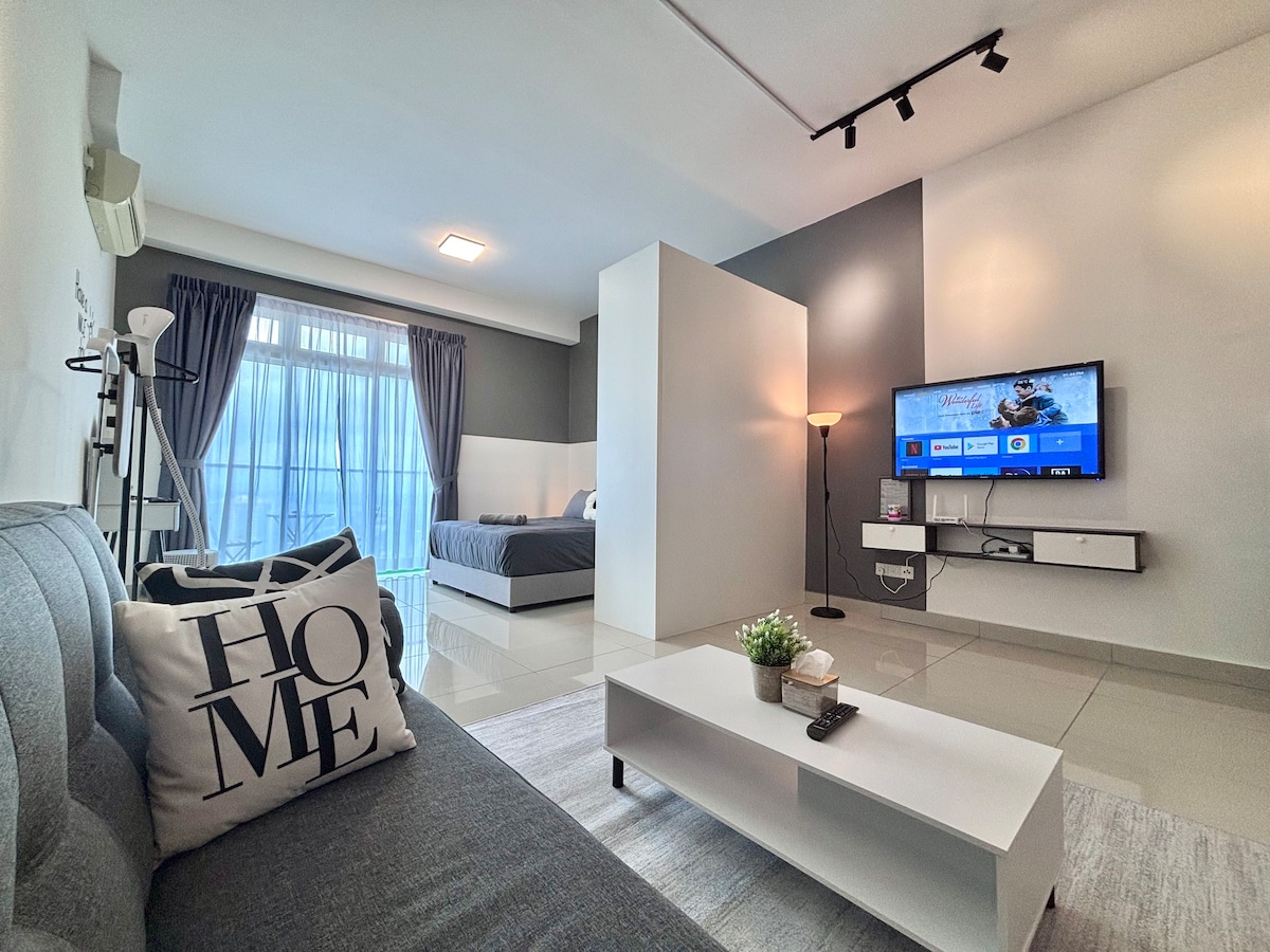 Cozy and fully furnished modern studio with 1 queen bed, a comfy sofa bed, refrigerator, washing machine, and TV with local channels. Enjoy peace of mind with reliable and experienced security on-site. 5 mins to Angsana Mall or Paradigm Mall 15 mins to CIQ/JBCC (via Woodlands) 20 mins to Legoland Malaysia, IKEA, Toppen, or AEON Tebrau 20 mins to 2nd Link CIQ (via Tuas) Perfect for a quick getaway or a convenient stay!