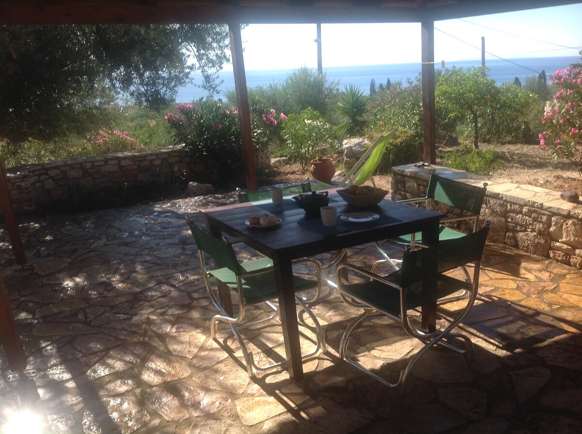 Situated in a secluded area but stil only 5 minutes from the village Chrani and the sea this country home offers absolute peace and quietness . It has a stone patio with pergola where guests can sit and enjoy the sea view and the sounds of nature.