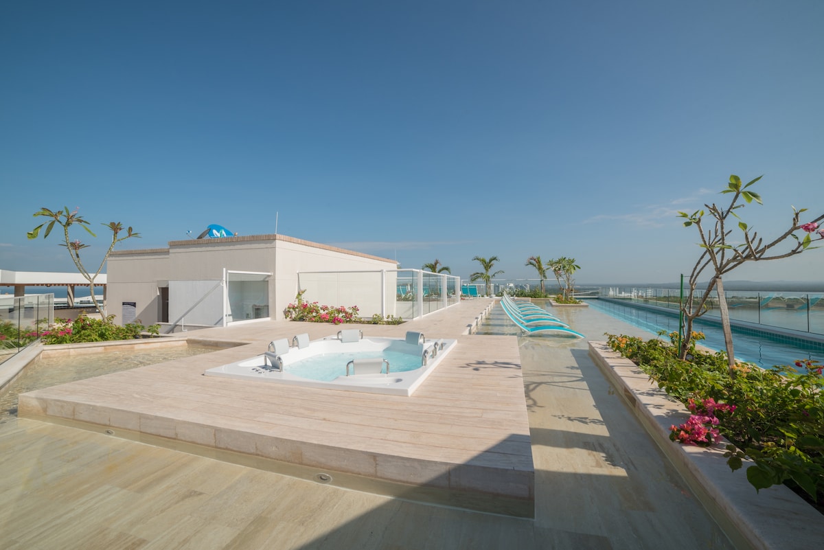 Beautiful new one-bedroom apartment with private patio. Excellent location: 3 minutes walk from the beach, 5 minutes to Rafael Núñez airport and 10 minutes to the Walled City. Spacious rooftop with 2 jacuzzis overlooking the Caribbean. Fully equipped with modern amenities. Hot water, which is not common in Cartagena, is available at our property.