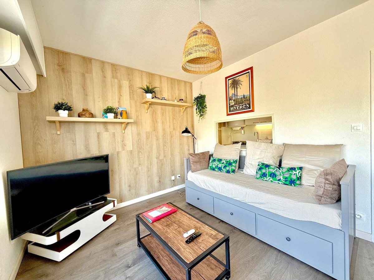 Enjoy a beautiful 29 m2 apartment, refurbished, elegant and located in the heart of the charming town of Carqueiranne. You can come as a maximum of 3 or as a couple with 2 small children. Assets: • Large 21 m2 garage included with your stay • Balcony overlooking a wooded view and south-facing • 4 min walk to the port and beaches and 5 min to the city center. • Located near the bike path overlooking the most beautiful walks in the area • Quiet and secure residence