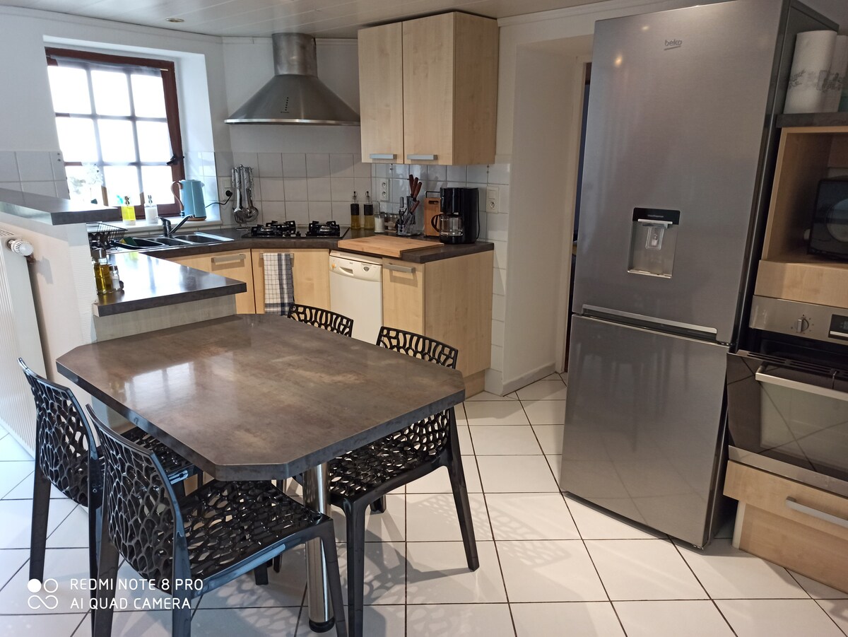Spacious rooms, high ceilings (3.80 m), beautiful natural light, stone and wood construction, antique furniture, complete new appliances, central heating + wood stove. Isolated, natural and quiet environment. Close to shops (6 km Orgelet and 10 km Lons-le-Saunier). Close to many tourist attractions. Ideal for starting hikes, open year-round, minimum rental 2 nights, weekend or week. 5 beds (1 bedroom + 1 convertible).
