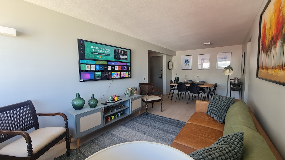 Luminoso departamento, bien equipado con piso flotante en living y dormitorio. El dormitorio tiene cama Box Spring de 2 plazas, impecables sabanas, tiene un Smart Tv led cuenta con Netflix , internet via wifi. La cocina cuenta con refrigerador, horno eléctrico, microondas, tostador, ollas y utensilios de cocina para cocinar. Tiene loza y cuchillería completa. Si esta mas de 6 noches dejo sabanas de recambio. El balcón cuenta con una terraza con mesa y 2 sillas.