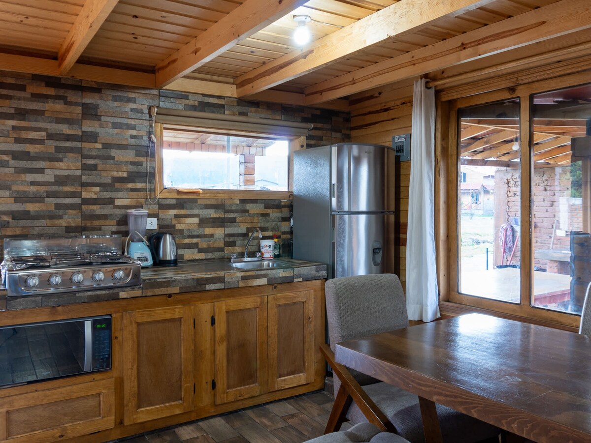 Cabaña con servicio de luz agua y drenaje Chimenea Sala Escalera para el ático Comedor para 6 personas Abanico de aspas de 4 velocidades Cocina con refrigerador Asador exterior para carnes asadas Microndas Estufa Licuadora Tostador Cafetera 1 juego de platos para 6 personas 1 juego de vasos para 6 personas 1 juego de sartenes 1 juego de utensilios de cocina 1 juego de cubiertos para 6 personas bote de basura Velador de noche servicio 24 horas