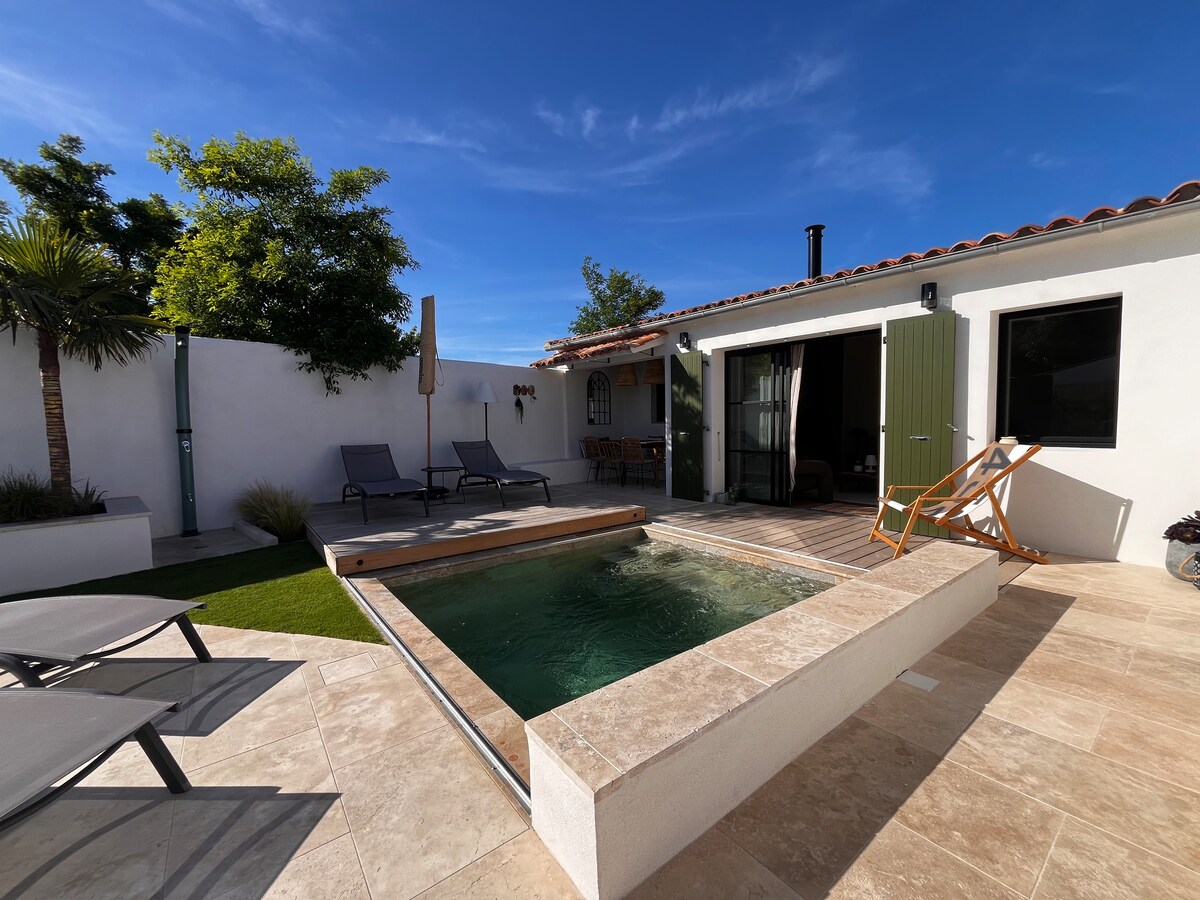 In a quiet area, 250 m from the most beautiful beaches of Ile de Ré (5 min walk), detached house of 100 m2 with heated pool (8 m x 3 m) from April to October (if the outside temperature allows) completely renovated, very bright, full of charm, volume and beautiful materials, at the end of a cul-de-sac and without neighbors. Over 600 m2 of garden. 15 min walk to Couarde market and 5 min by bike.