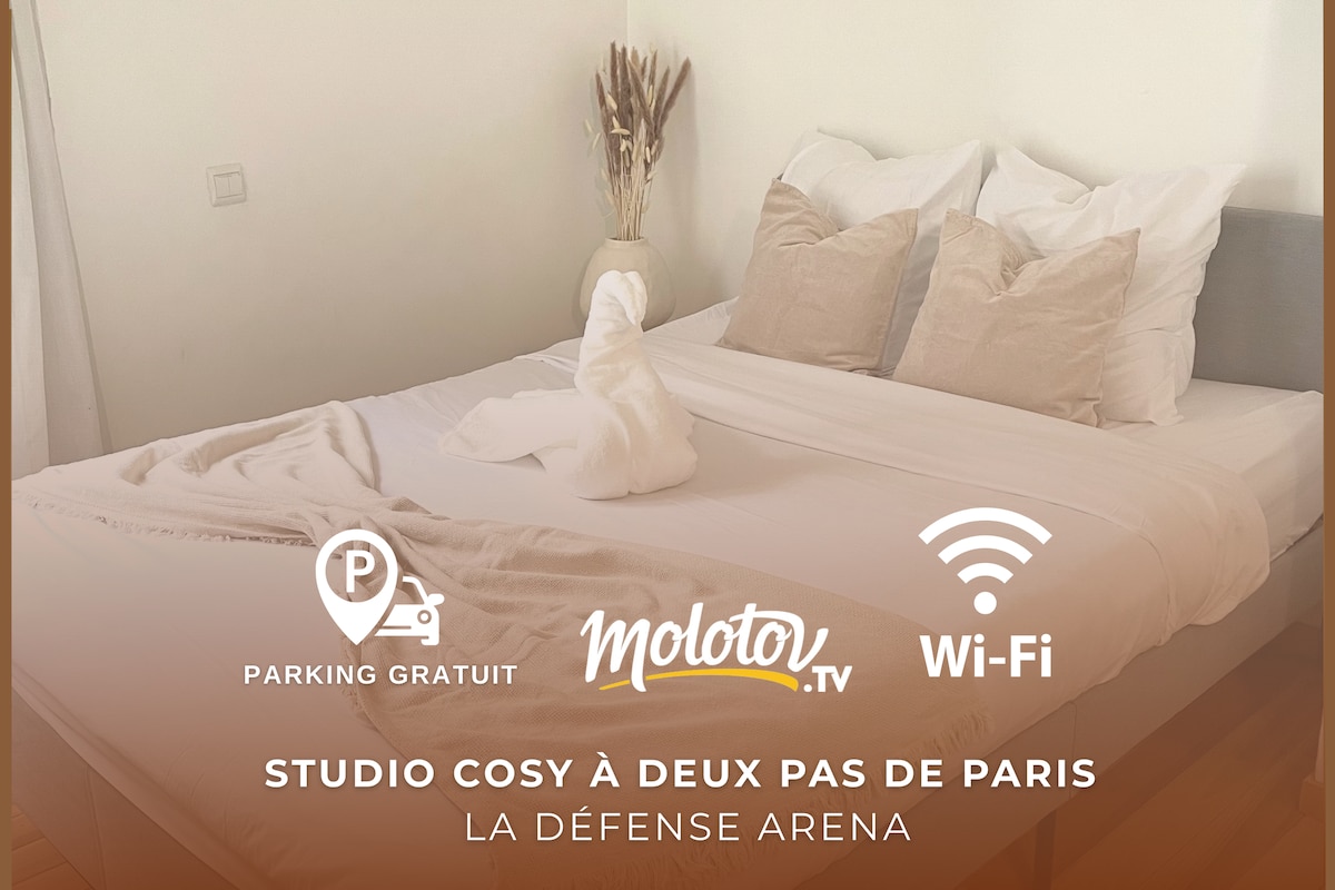 Whether you're on vacation or a business trip, our fully equipped studios (just unpack and settle in) are thoughtfully designed to provide all the comfort you need for a pleasant stay, approximately a 13-minute walk from La Défense station, which directly connects to the city center of Paris in just 15 minutes. Our studios are situated in a modern and secure residence, surrounded by parks, in a quiet and welcoming neighborhood, close to all amenities (local shops, restaurants, 4 Temps, Arena...)