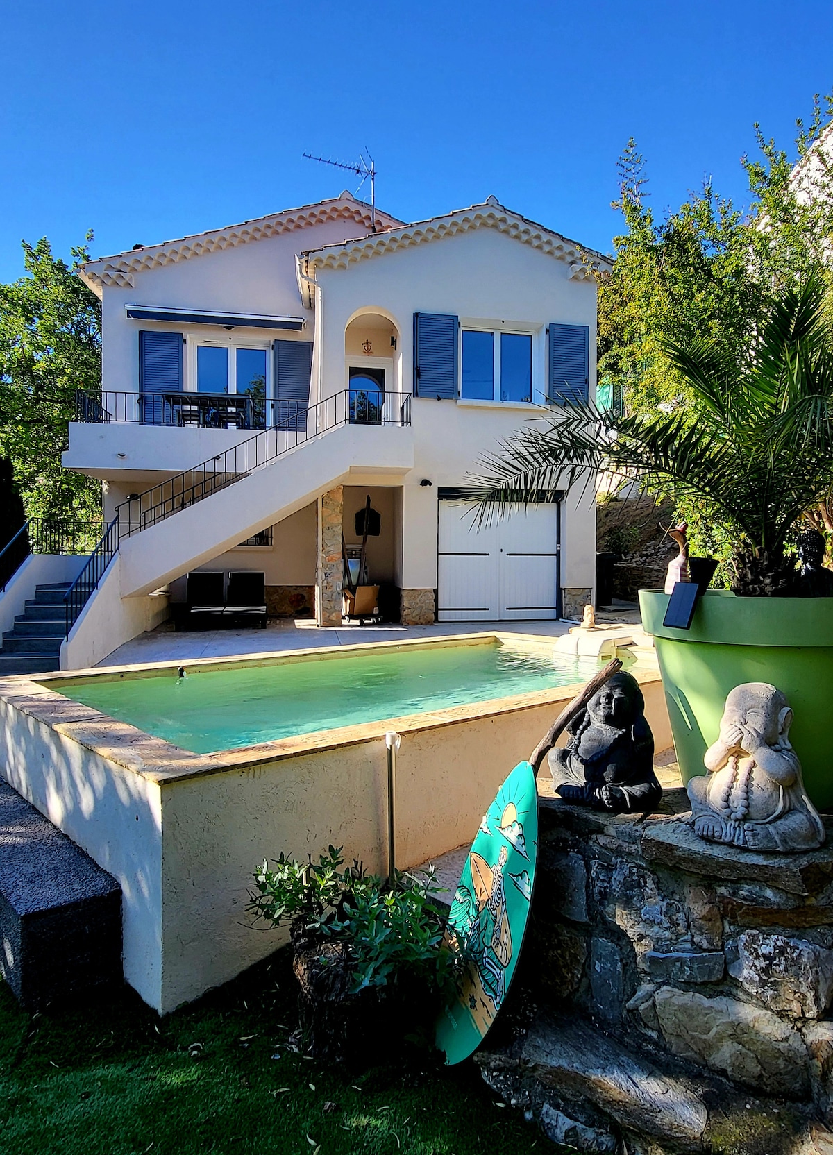 Very spacious 220 m2 accommodation in my villa on the hills of Hyeres in a residential area. Exclusive access to the wooded and flowered garden as well as the pool Exceptional view of the islands and the city of Hyeres A pleasant pergola will allow you to have your meals in the shade and if it is a little cooler, you can sit under a spacious veranda. Parking is easy on the street close to the house.