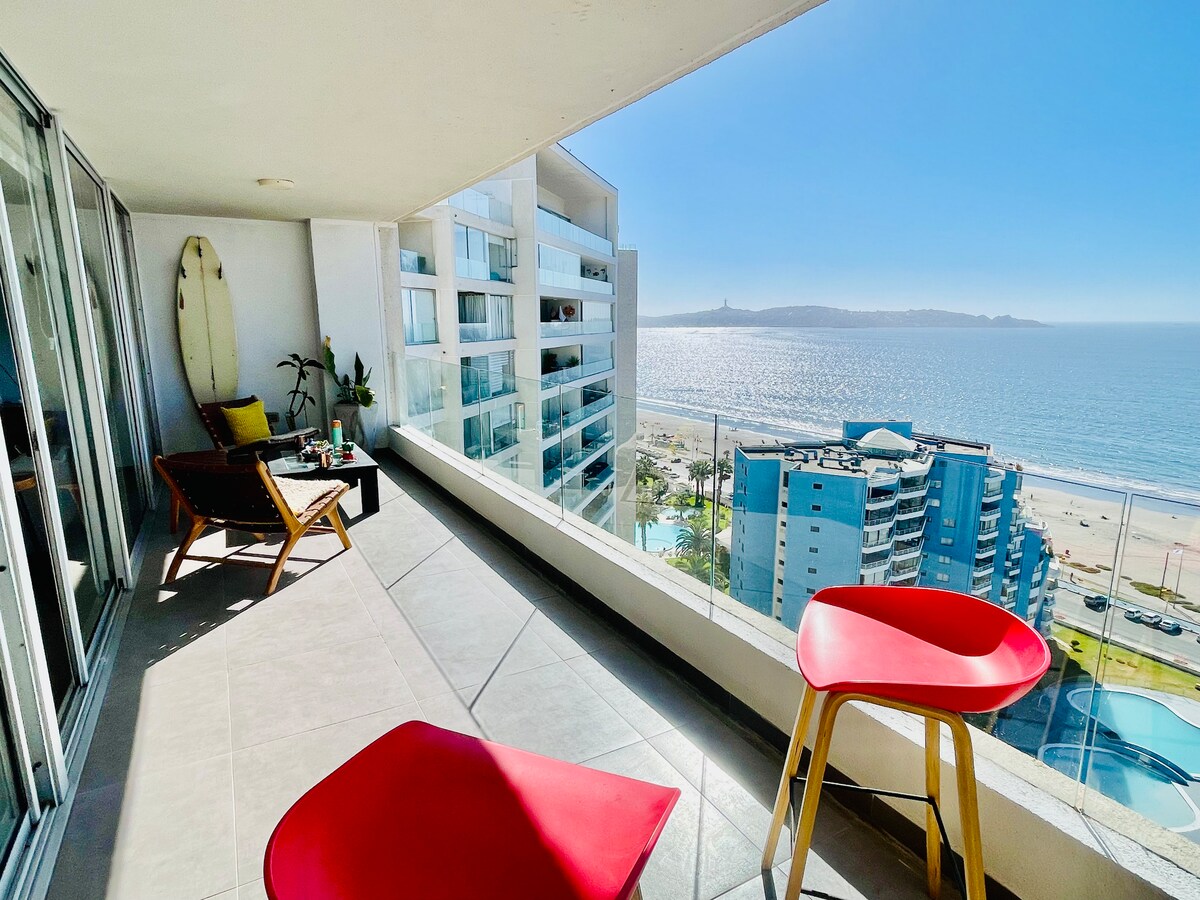Luxury apartment in the Jardín del Mar building. On the beachfront, facing the sea, next to Casino Enjoy. Apartment on the 4th floor, large terrace overlooking the ocean and main pool. Fully equipped. Large outdoor pools, heated pools. Includes linens and towels. Jacuzzi, gym, sauna, heated pool, wear a bathing cap. Private parking. It includes SmartTV, cable TV (including national soccer) in the master bedroom and living room, and Internet for remote working.