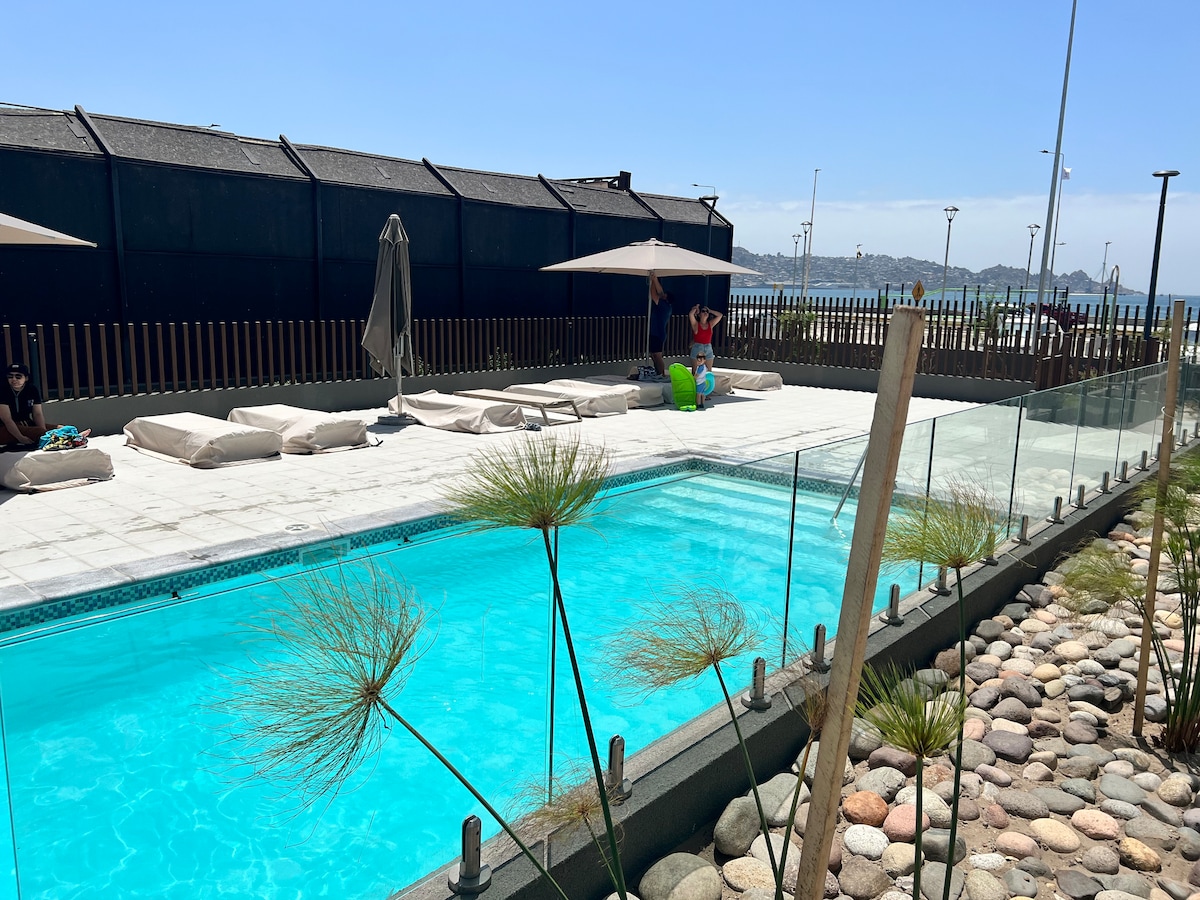Apartment with SPA in Costa Herradura Condominium in Coquimbo. It is located on the First Coastal Line, 6th floor, RIGHT IN FRONT OF THE SEA, fully equipped with everything you need to give yourself a few well-deserved days of rest. It has a rooftop SPA with free facilities of Steam Baths, Sauna, Gym and also a panoramic Jacuzzi at low cost overlooking the ocean and the stars, upon reservation, It also has a beautiful swimming pool, barbecues from Tuesday to Sunday and direct access to the beach.