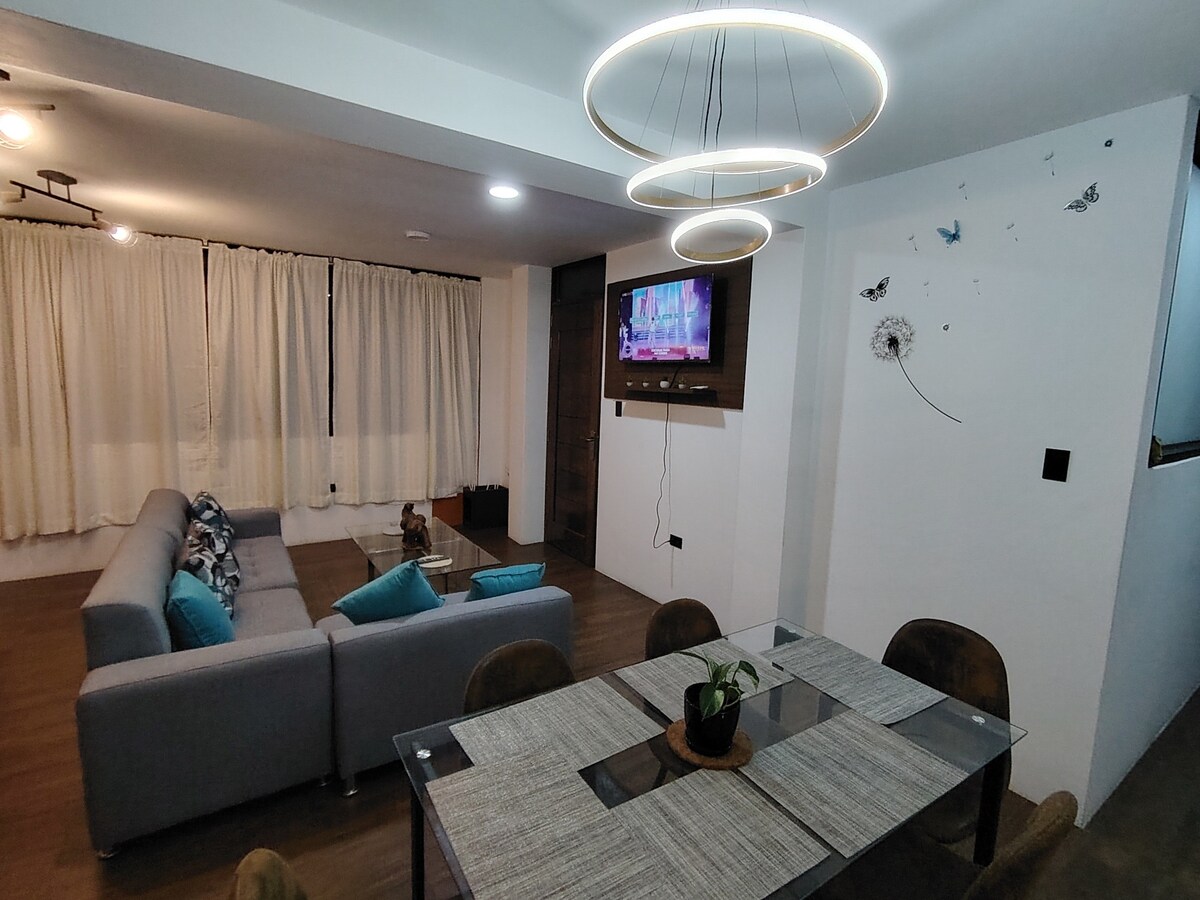 Enjoy the comfort of this beautiful, comfortable, quiet, safe apartment with an ideal location for getting to know Cajamarca. It is located 9 minutes from the historic center of Cajamarca, 5 minutes from the airport, 3 blocks from the main shopping centers, very close to various restaurants, wineries, Essalud II and great availability of different means of transportation.