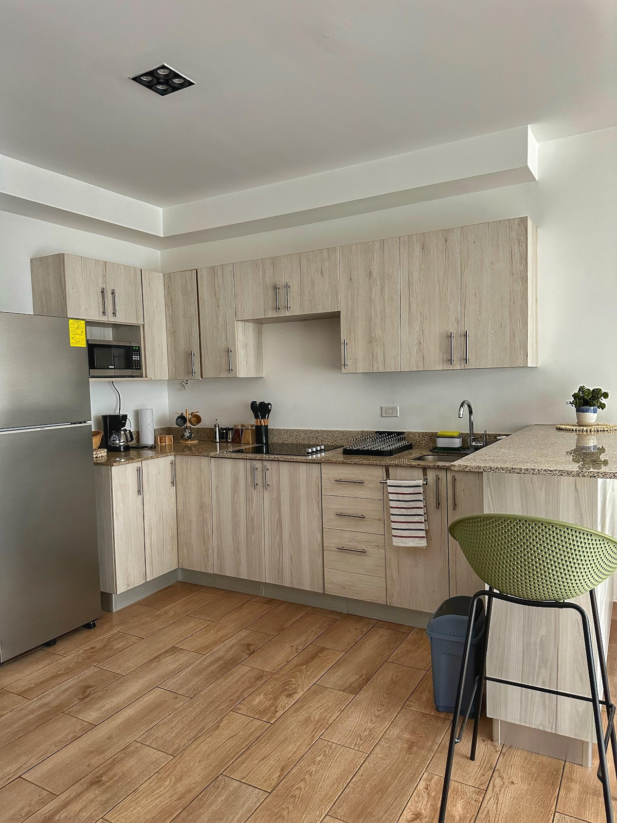 Modern, fully equipped apartment with panoramic views of San Salvador’s volcano. Located on the 9th floor of a residential complex in Santa Tecla, it’s ideal for working, relaxing, and unwinding. Surrounded by spacious green areas and recreational spaces that help balance your day between work, family, exercise, and rest. Conveniently close to supermarkets, restaurants, and a variety of shops, with quick access to main roads connecting to San Salvador, La Libertad, and the western region.