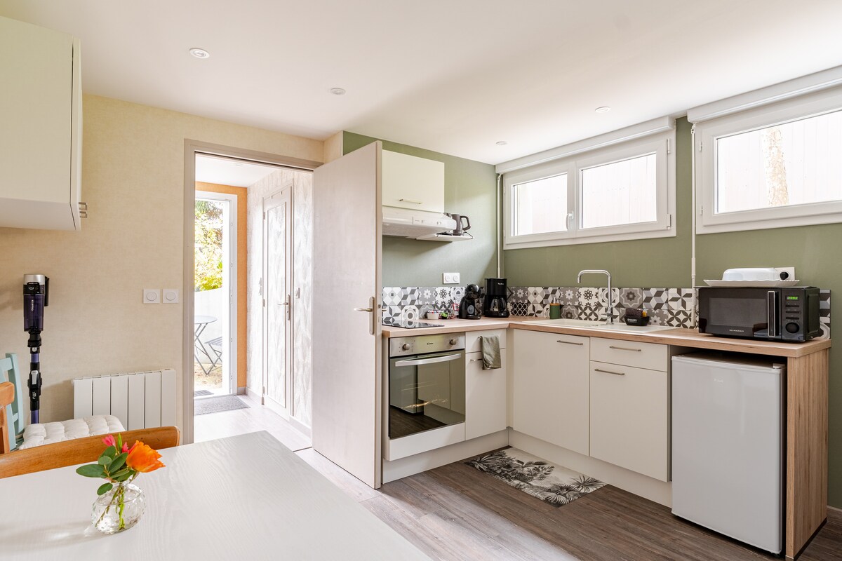 Welcome to you! This cocoon studio, 33 m2, freshly renovated, is located 500 m from the Equestrian Center. It is located in a small secure residence, on the 2nd floor, without elevator, quiet, surrounded by greenery. A small terrace allows you to enjoy it. You have a free parking space in the basement. Bakery and fresh produce 24/7, 100 m + Aldi. Bathroom with shower, and separate toilet. Queen size bed, very comfortable. Equipped kitchenette.