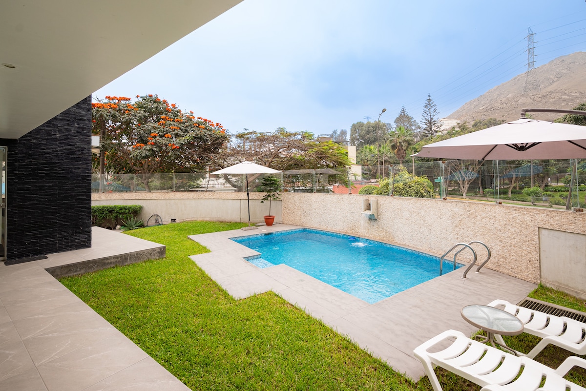 Experience the perfect blend of design and comfort in our spacious home. Newly renovated bathrooms, multiple outdoor living areas and lush gardens, ideal for birdwatching. Nestled in a sunny, tranquil area of Lima with exclusive access to all amenities, a well-equipped kitchen, pool, & reliable WiFi. Walk to markets, coffee shops, restaurants, pharmacies, and more. Whether you're seeking relaxation or entertainment, our home provides the ideal retreat for your stay in Lima.