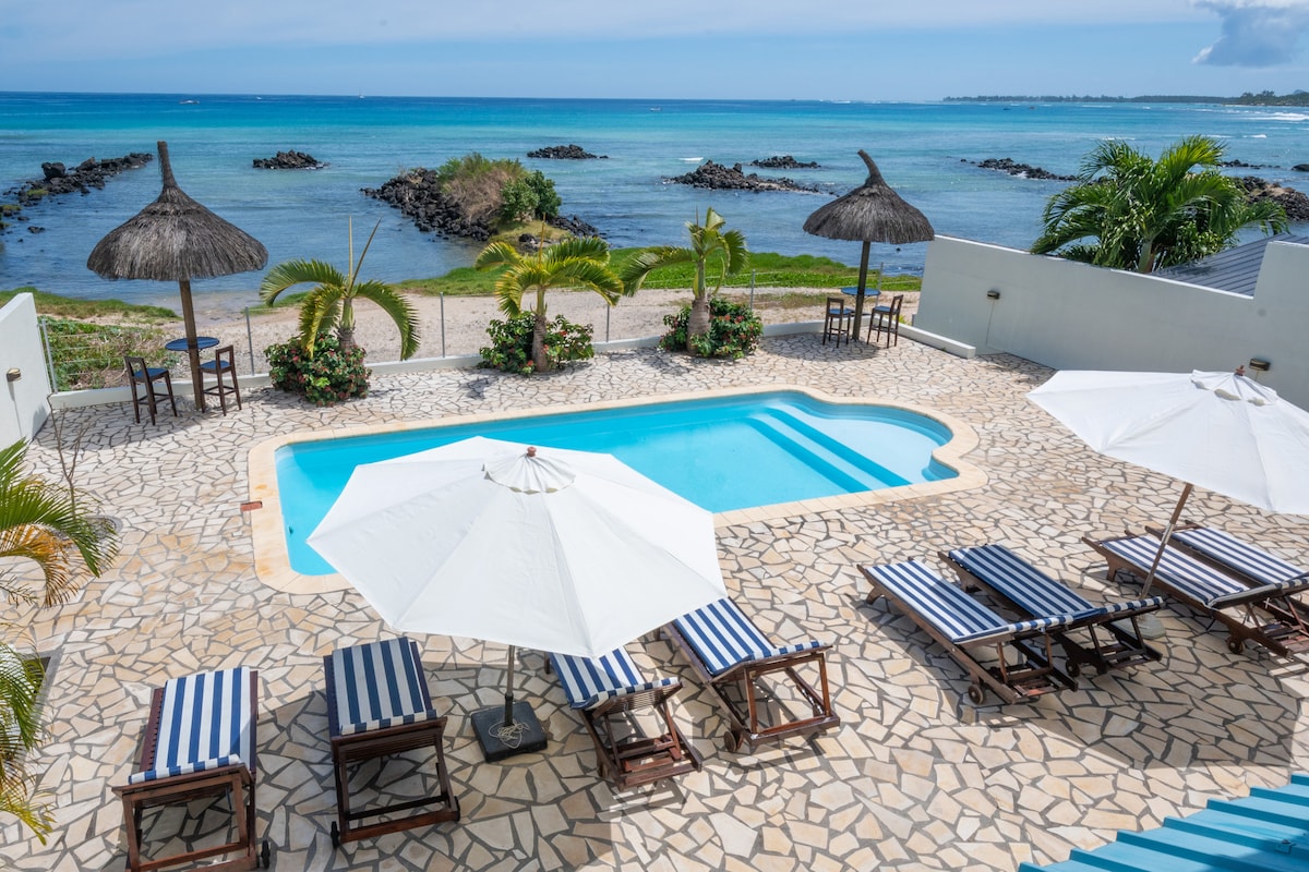 Offering breathtaking and picture perfect view of the lagoon, beach and island of the South East of Mauritius, this luxury beachfront apartment is amazing for a great holiday with family or friends. Modern style furniture and decor, featuring 3 comfortable bedrooms with ensuite bathrooms, a spacious living area. Providing guests with a private garden where they can relax and enjoy a quiet evening enjoying a delicious barbecue, after spending the day lounging around the shared swimming pool.