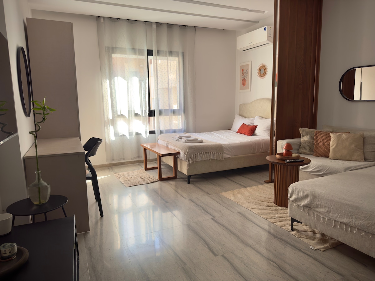 ✨Charming S1 with private garden & parking – close to the airport ✨ Just 5 minutes from Tunis-Carthage Airport, enjoy a modern, air-conditioned and heated S1 apartment, tastefully furnished and equipped with high-speed Wi-Fi. Located on the ground floor of a secure residence, it offers a private garden of 40 m² and a private parking space in the basement. Supermarket, restaurants and shops within walking distance. Quiet and pleasant neighborhood.