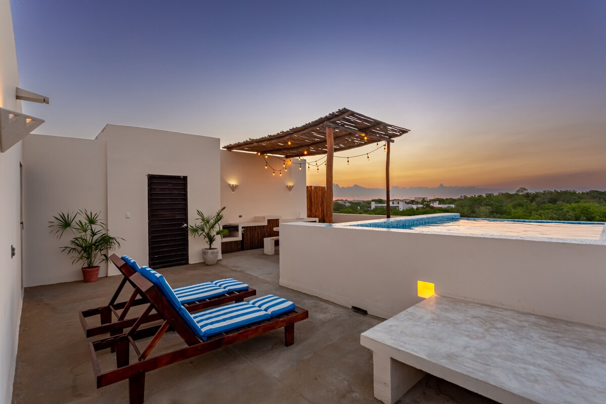 Escape to your Jungle Retreat. Unwind in ultimate privacy at our 1 bdrm penthouse. Relax on your own private rooftop, complete with a refreshing plunge pool (unheated). Nestled in the jungle, this secluded heaven offers a serene escape away from the crowds. Just a short drive from Tulum Pueblo (10 mins) and the beach (20 mins), our penthouse is the perfect blend of tranquility and convenience. Please note: access is through rough unpaved roads. Just drive slowly. Renting a car is recommended