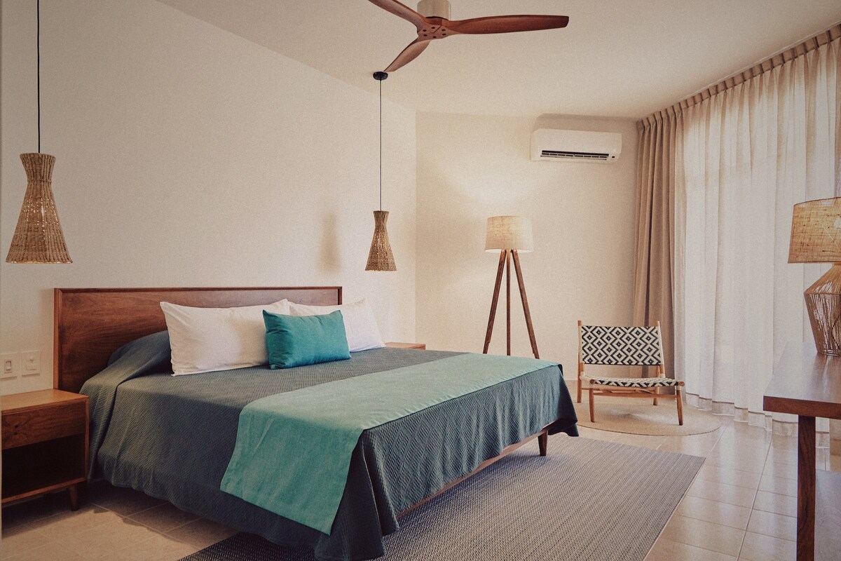 Descubre los tesoros locales desde este moderno alojamiento. ¡Nuestra ubicación y relación calidad-precio son insuperables! A solo 2 minutos caminando a las playas más hermosas de México y del mundo. La suite 9 está ubicada en la planta alta por lo que ofrece increíbles vistas a la selva de Tulum! Encantadora habitación construida con materiales nativos, un interior cómodo y fresco y ambiente boho chic! Cama King Size, baño privado con iluminación natural y mini refri, aire acondicionado y mas.