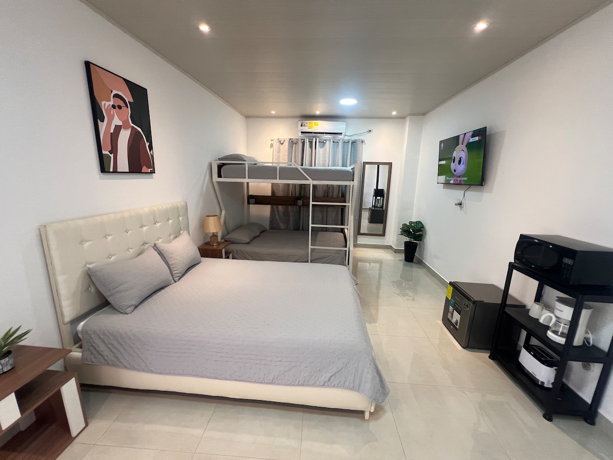 Your family will be close to everything if you stay at this accommodation. With easy access to public or private transportation. It has 2 double beds, mini bar refrigerator, air conditioner, 3-burner gas stove, separate bathroom and parking for your vehicle. Just a few minutes from downtown Chitré. You will have parks, restaurants and endless places to visit nearby.